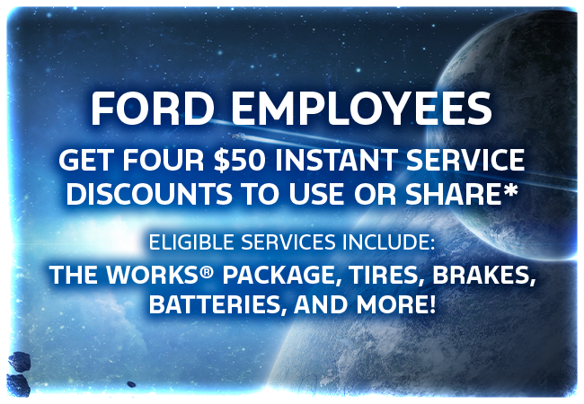 *The S-Plan Friends & Family Maintenance Savings Program is available to active U.S. Ford Employees. Eligible employees may generate a maximum of four (4) PINs at fordservicediscount.com from 4/15/26 to 9/7/26 for personal use or for distribution to friends and family members. Limit of one (1) PIN redemption per Vehicle Identification Number (VIN). Qualifying PIN recipients are eligible to receive a $50 instant discount on eligible maintenance services. A minimum total customer pay Repair Order spend of $100 is required to qualify for the discount. Eligible services include oil change, The Works® Package, or the purchase and installation of brakes, batteries, tires, wipers, and filters. Services must include the purchase and installation of genuine Ford or Motorcraft® parts, or tires from the following brands: Goodyear®, Cooper®, Kelly®, Michelin, BFGoodrich®, Uniroyal®, Continental, General Tire, Falken, Hankook, Bridgestone, Firestone, Toyo®, Pirelli, Yokohama®, or Nitto®. Services must be performed at a participating U.S. Ford Dealer, Lincoln Retailer, or Quick Lane® Store. Prior authorization is necessary before work is performed, and a program-provided PIN must be presented at the time of write-up. Offer valid only on Ford and Lincoln vehicles. Generated PINs expire 60 days after the date of generation. PIN eligibility is limited and subject to change. See a Service Advisor for offer details through 9/7/26. Ford reserves the right to change, modify, or discontinue this program at any time. Quick Lane®, Motorcraft®, and The Works® are registered trademarks of Ford Motor Company.